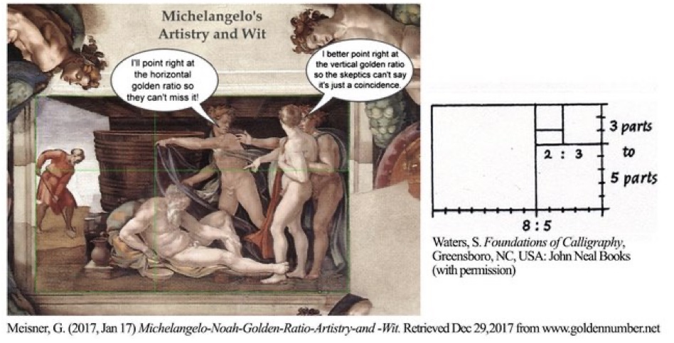 As seen in the pictures below, the use of the Golden Mean within a painting creates pleasing, proportional relationships.  These relationships are characterized by pairings of Fibonacci numbers.  Each relationship seen in the chart is a pair of Fibonacci numbers whose relationship to one another is approximately 1:1.618 (8 divided by 5 = 1.6, 5 divided by 3 = 1.666…). A Golden rectangle has sides that are in the Golden Ratio.