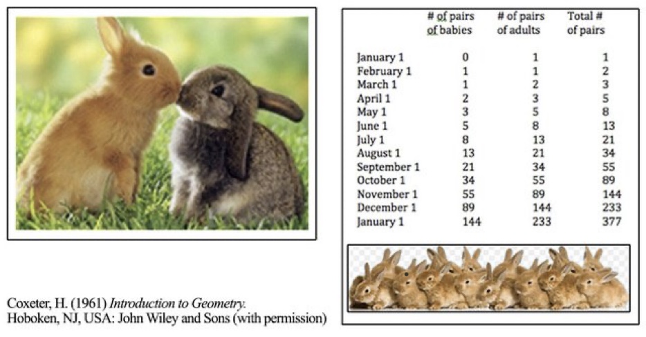 What would happen if a pair of rabbits were put into an enclosure to breed?  How many pairs of rabbits will there be after a year if it is assumed that every month each pair produces one new pair, which begins to  bear young two months after its own birth? It was not the answer 377 that was most interesting, but the emergence of the pattern by which this could be solved:  0, 1, 2, 3, 5, 8, 13 ……  the string of numbers that begins with 0, 1 where each subsequent number is the sum of the previous two numbers. This is credited as the first known written record of what later became known as the Fibonacci sequence.