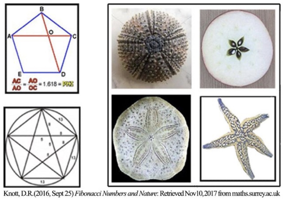 Another interesting note in animal growth and form is the presence of the Fibonacci number 5 and the Pentagon shape, which has Fibonacci elements, as can be noted in the diagrams below.   The shape is visible in the radial symmetry of some plant and animal growth from starfish to sand dollars; from the 5-star pattern of carpels visible inside a transversely cut apple to sea urchins and 5-petaled flowers.