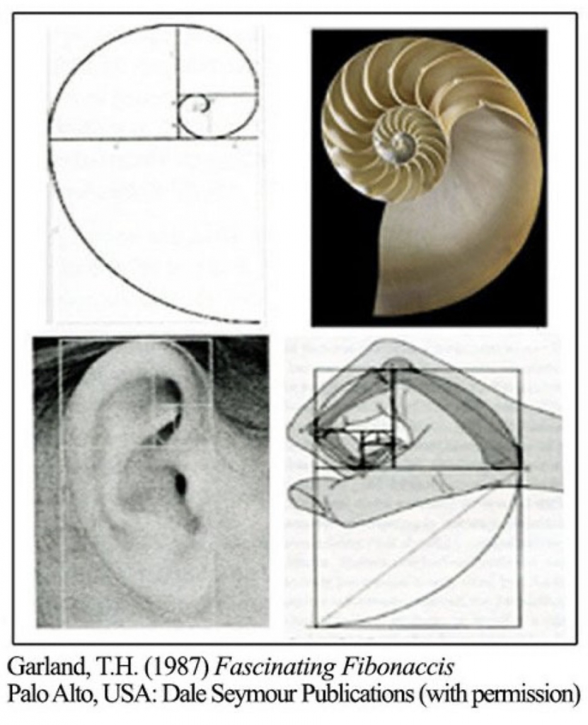 One of the most fascinating examples of the sequence in the animal kingdom is the spiral that characterizes much animal growth.    The spiral below demonstrates the construction of the logarithmic spiral – a long slow spiral characterized by all radii from its center intersecting the spiral at exactly the same angle.   Using the Fibonacci sequence, the spiral grows to accommodate the growing animal inside in a nautilus shell – and additional examples can be seen in the human ear and in the human fist.