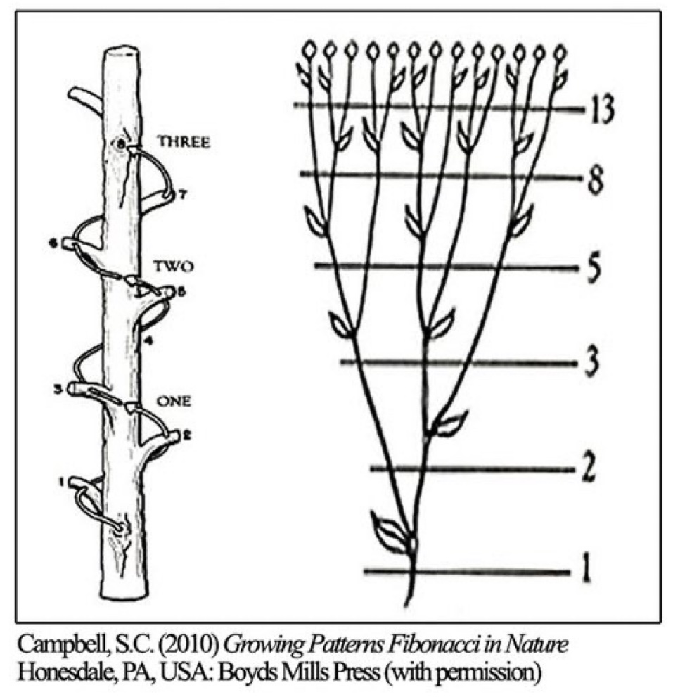Plant growth patterns are another area where Fibonacci patterns can be observed.  Plants grow toward sunlight, growing in spirals as they reach for moisture, sunlight and air, which are found to be available cyclically.  The tip of a branch moves in a somewhat circular motion as it lengthens and grows.  As a branch grows it generates leaves in fractions of a full turn of the branch (after 2/5 or 3/8 or 8/13th of a full cycle for example) rather than at equal intervals, so that new leaves are not directly over earlier growth, which would otherwise tend to deny them of the nutrients needed to continue to grow.  These phyllotactic ratios (Phyllotaxis) are usually Fibonacci numbers.  In the diagram below eight stems were produced in three complete growth spirals.